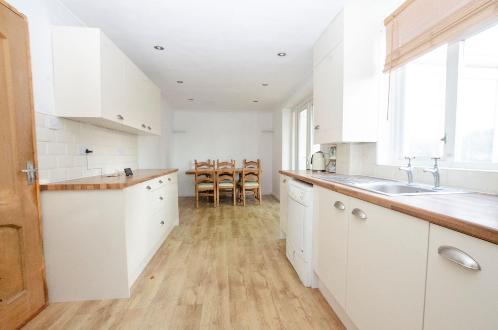 Range of modern fitted wall and base level units with wood block effect worksurfaces, stainless steel sink and drainer with mixer tap, gas cooker point, built in microwave, space and plumbing for washing machine, fridge/freezer, and dishwasher, wood effect flooring, double radiator, ceiling downlighters, double glazed window to rear aspect, door to utility room, double doors to conservatory.